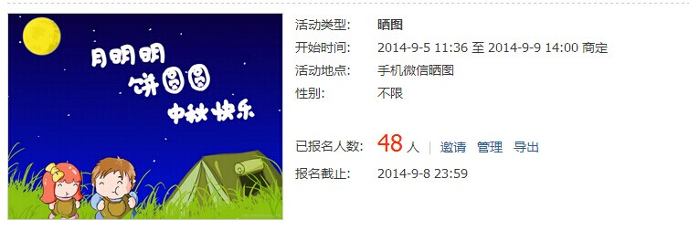 活動概述:繼曬美照活動后,微信平臺緊接著推出了曬出全家福活動。訂閱E滁州官方微信號,打開底部菜單的“曬團圓”或者直接回復“曬團圓”可以獲得參賽鏈接。曬出自己的全家福照片分享到朋友圈拉票,前五名可獲得月餅以及旅游門票。