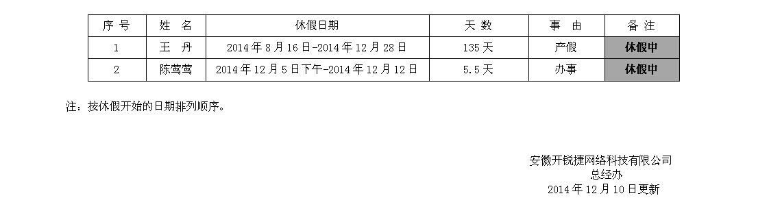 現(xiàn)將大家自主安排的休假日期予以公布,請(qǐng)查照。祝大家輕松快樂、事事順心!