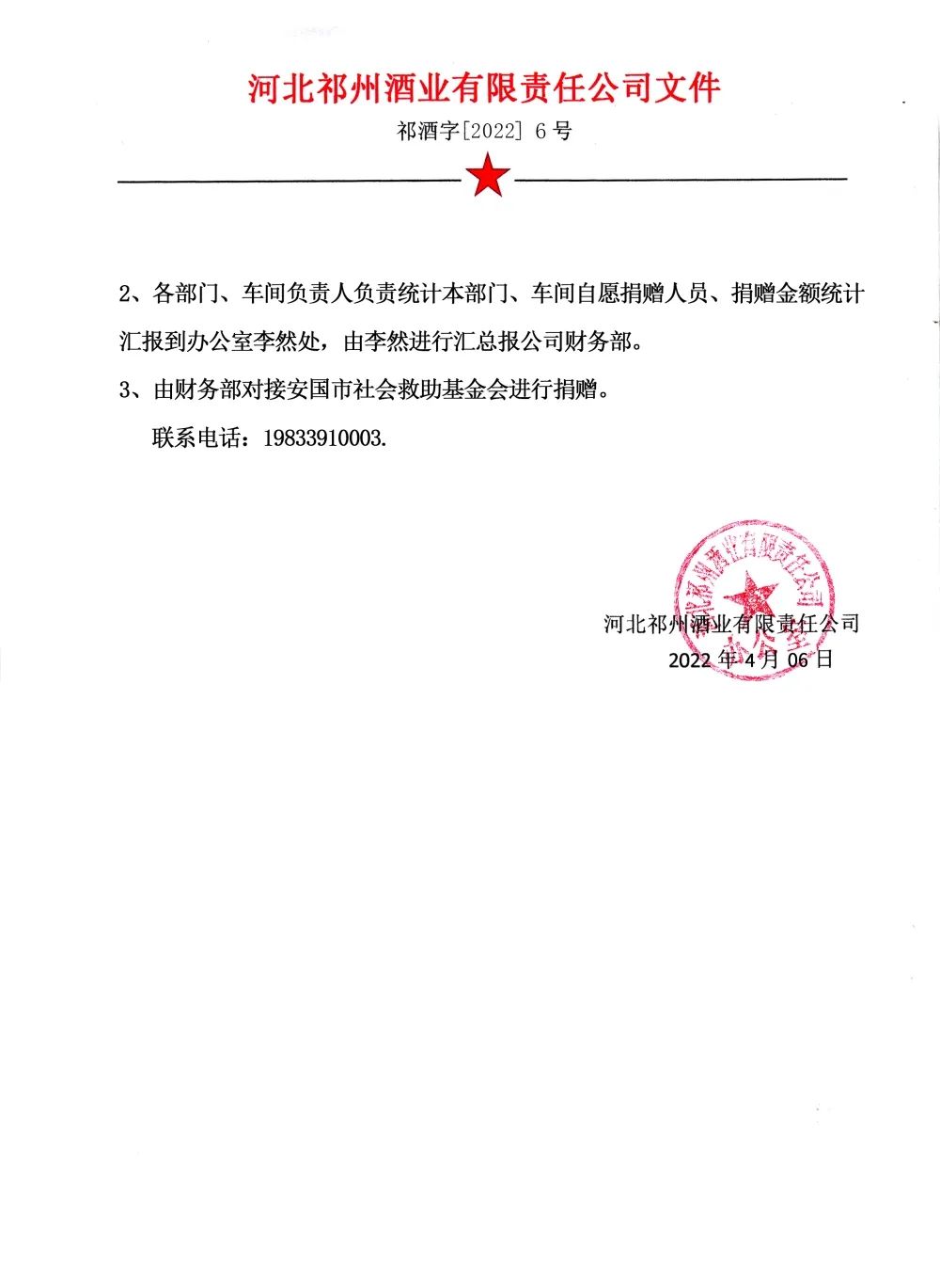 同時,祁州酒業員工在積極落實各項政府防疫要求,做好企業自身疫情防控工作的同時,紛紛主動要求要為家鄉抗疫做點實事,自發以班組、部門為單位開展義務捐款活動,截至目前員工踴躍捐款正在持續進行,捐款數額不斷追加,后續統計完畢將統一進行捐贈。
